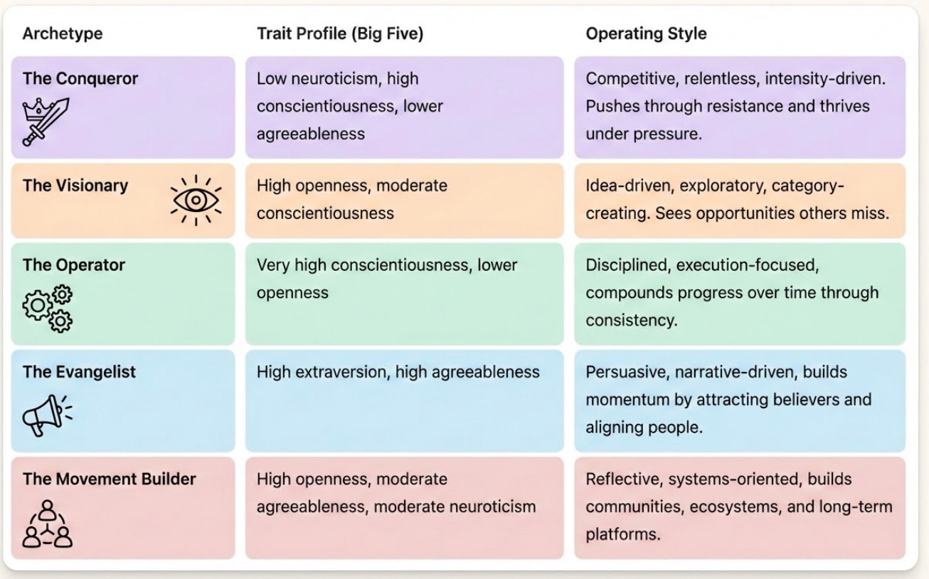 These archetypes are simply different configurations of the same underlying traits. The Conqueror aligns most closely with the archetype promoted in venture culture. Relentless, emotionally stable, and intensity-driven. But the others represent equally plausible paths, each with its own strengths and tradeoffs.